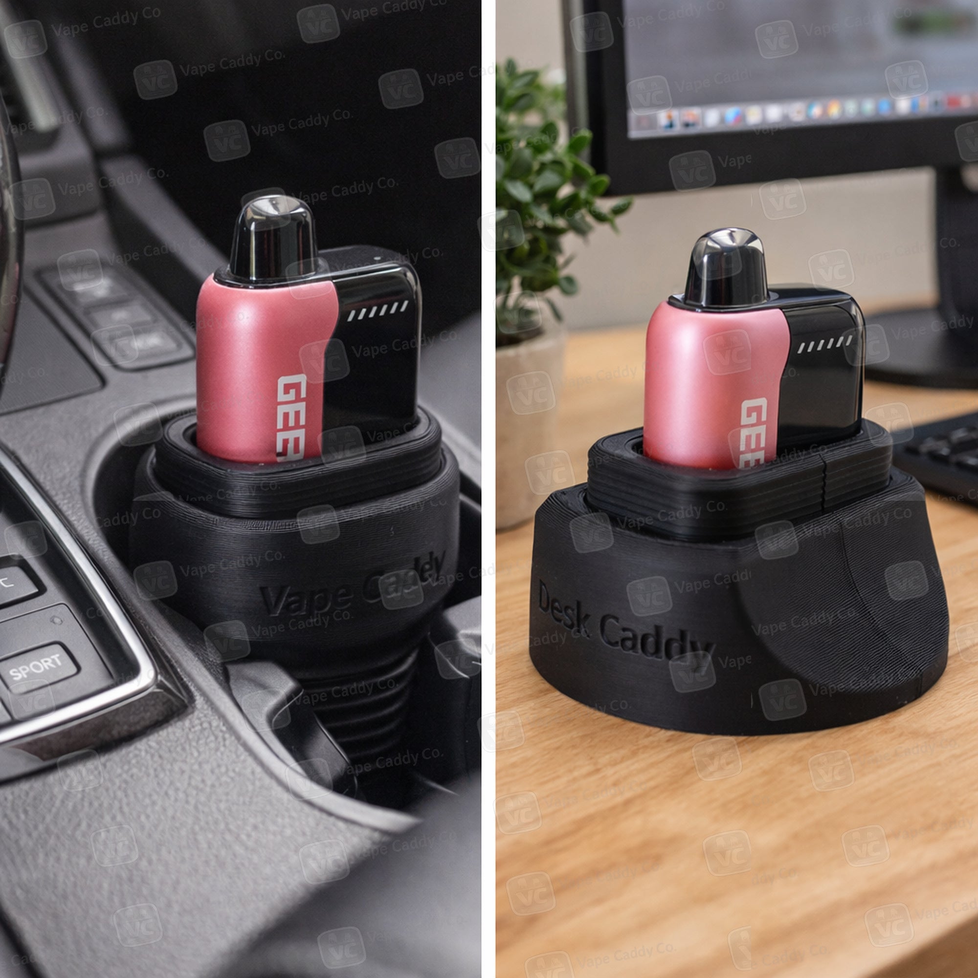 A modular vape holder with interchangeable inserts that keep your device secure in cup holders, on desks, and anywhere you use it.